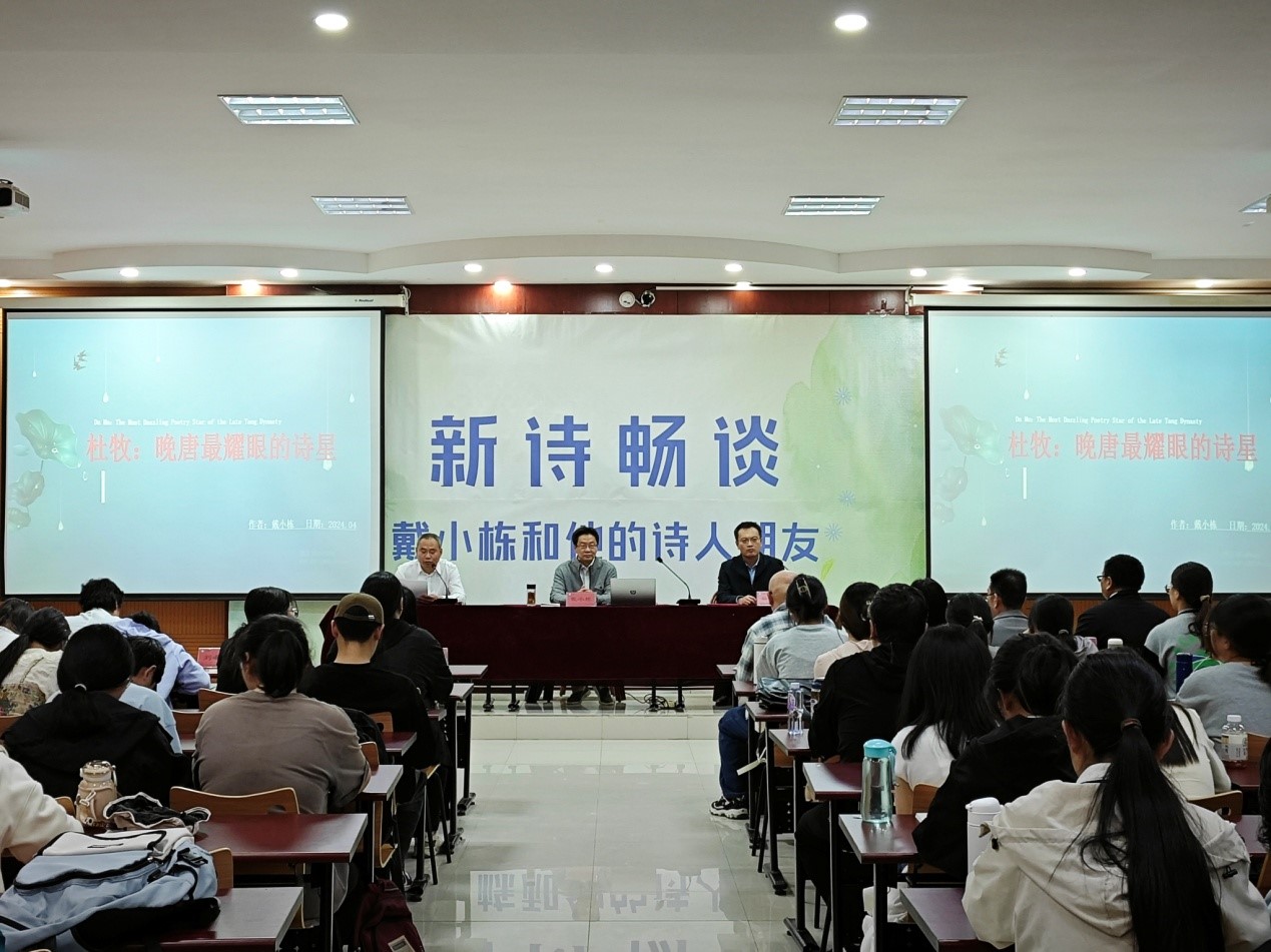 报告前我校蒋涛涛副校长代表beat365唯一官网聘任戴小栋为beat365唯一官网文学与新闻传播学院兼职教授。随后戴教授以《杜牧——晚唐最耀眼的诗星》为题,向在场师生作了精彩的报告。戴教授从诗人的生平讲起,分析了杜牧的人生境遇对其品格和诗歌的影响,并以其生平为主线,通过讲解杜牧人生的三处福地,带领师生赏析杜牧不同时期的诗歌作品,归纳出杜牧诗歌的艺术特点。报告基于确凿的史料分析,既有感兴的诗性体验,更有理性的学术表达,有宏观视野的探究,也有微观文本的关注,全面而立体化地展示了晚唐杰出诗人杜牧的文学价值。