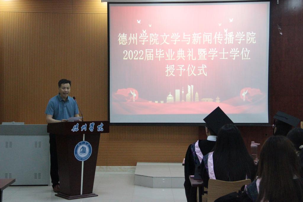 在庄严的国歌声中,毕业典礼正式拉开帷幕。文学与新闻传播学院学术委员会主席、委员为2022届本科毕业生援正流苏,授予学士学位证书并合影留念。教师代表的发言充满了依依别情,又带着殷殷期盼,希望广大2022届毕业生能够秉承“崇德启智,励志博学”的校训,乘风破浪,勇往前行,带着老师的嘱托和母校的期望奔赴祖国各地开始崭新征程。2022届毕业生代表向老师们表达了衷心感谢,感恩母校的培养,在四年的德院生活中,不仅学到了知识,更学会了怎样做人做事。