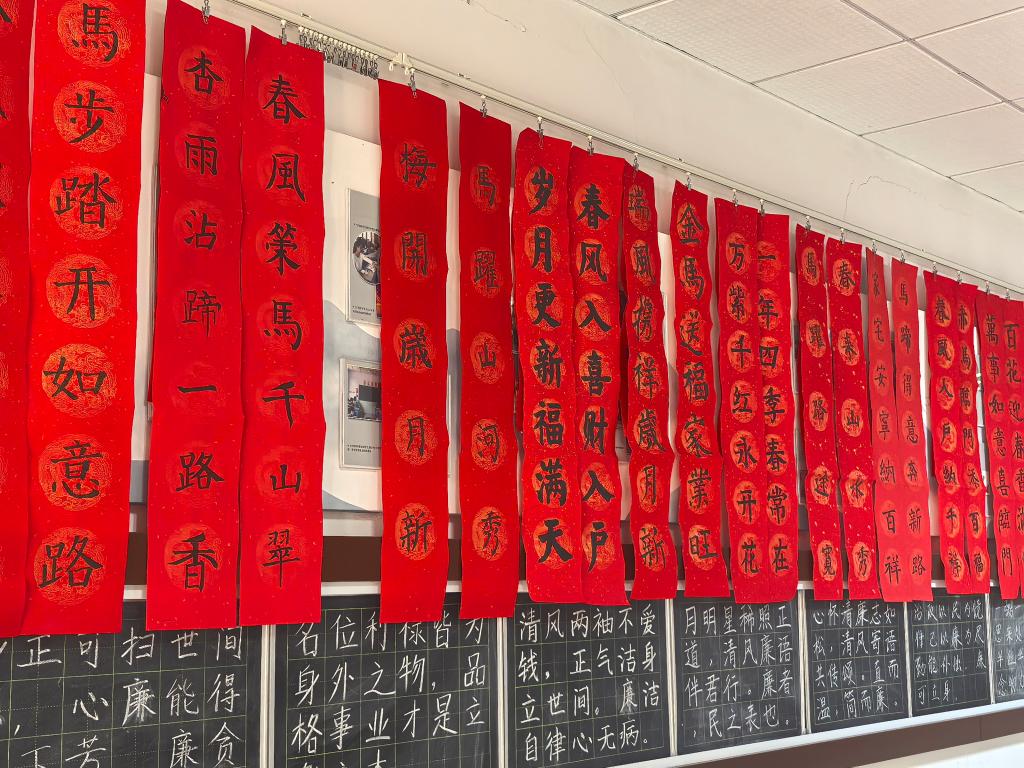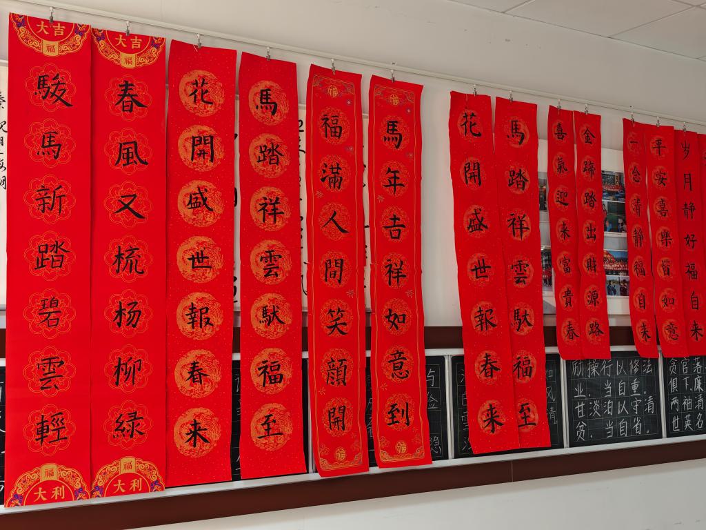 同学们铺纸挥毫、落笔成联,将书法技艺与文学才思融入春联创作之中。春联长廊内,红底墨字的作品错落棋布,墨香与红纸的暖意交织弥漫。“春风入户纳千祥,赤马临门添百福”笔势沉稳,藏着阖家纳祥的美好心愿;“百花迎春香满地,万事如意喜临门”对仗精巧,满含新春顺遂的真挚期盼。楹联的文学雅致与书法的艺术张力相得益彰,将中华传统文化的独特魅力展现得淋漓尽致。往来师生驻足其间,目光在一幅幅作品上流连,大家在红联墨韵的环绕里,沉浸式感受着传统文化的魅力,心底那份对传统的热爱与认同,也愈发浓烈真切。