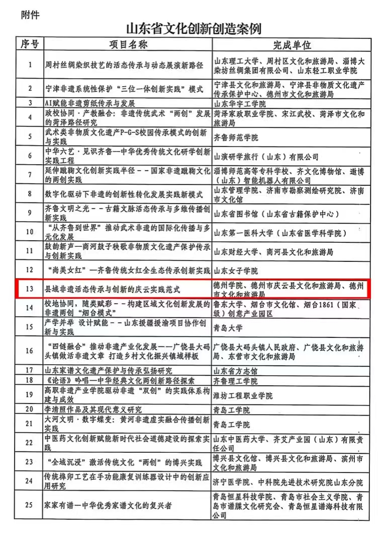 近日,山东省文化和旅游厅公布山东省文化创新创造案例名单,共计 181 项案例入选。beat365党委副书记、副院长黄传波牵头申报的 “县域非遗活态传承与创新的庆云实践范式” 成功入选。此次入选案例聚焦县域非遗传承创新核心议题,是学院响应省文旅厅文化创新驱动发展战略、主动服务区域文化建设的具体实践,彰显了学院在文化实践领域的扎实积累。