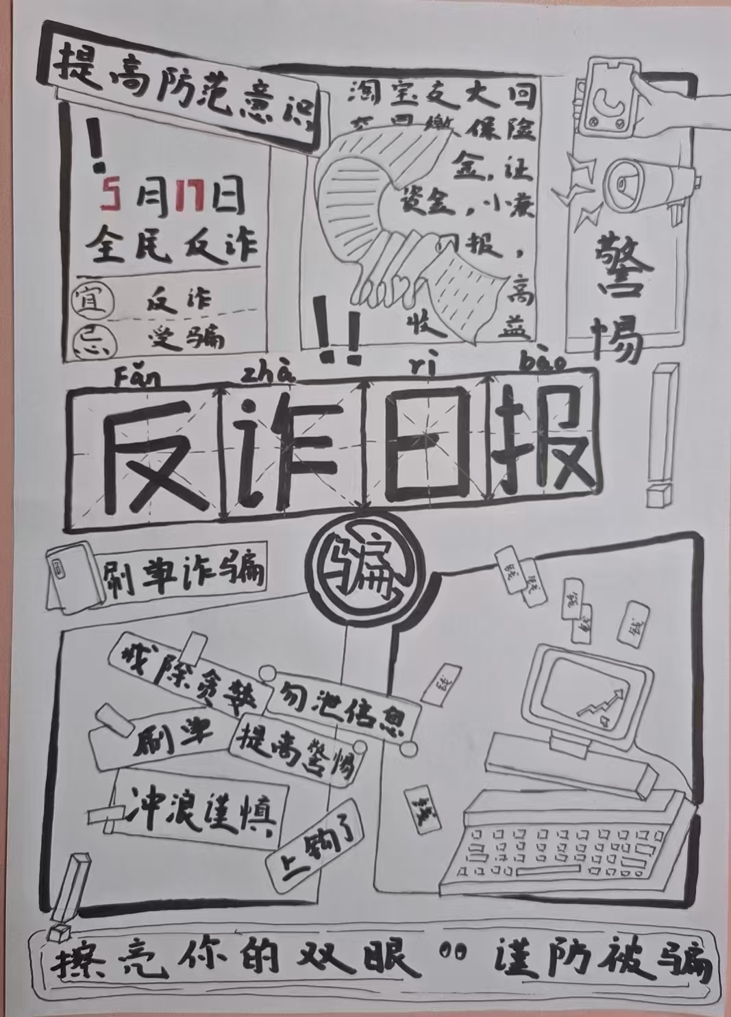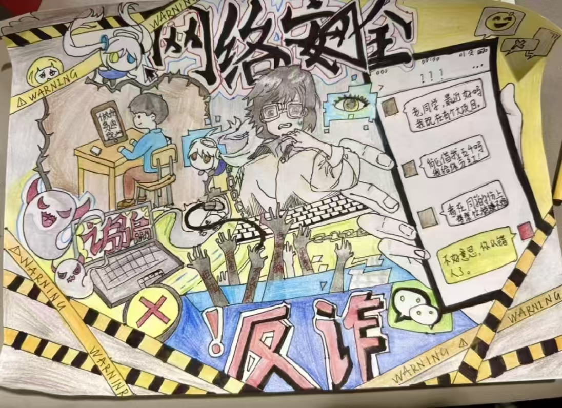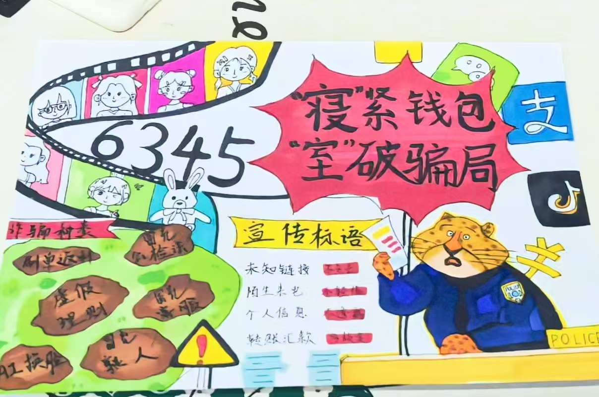 本次活动形式多样、内容贴近学生实际,吸引了学院各宿舍踊跃参与。在“宿舍反诈手绘海报”环节,同学们结合冒充好友、刷单返利等常见诈骗手法,巧妙融合宿舍生活场景与反诈知识,创作出一幅幅主题鲜明、警示性强的手绘作品;在“反诈徽章与标语设计”环节,同学们制作出独具特色的反诈主题徽章,并配以反诈标语。“宿舍反诈微电影”创作也是本次活动的亮点之一,同学们以宿舍为拍摄场景,自编自导自演,围绕学生生活中可能遇到的高频诈骗案例,创作防诈短剧。同学们在参与中学习,在创作中警醒,切实提升了识别和防范诈骗的意识和能力。