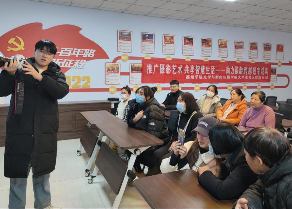 为深入贯彻落实党的二十大精神和习近平总书记对加快建设老年友好型社会的重要指示要求,更好地助力老年人跨越数字鸿沟,实现大学生服务社区,社区锻炼大学生的双赢互动、双向奔赴,12月15日,文学与新闻传播学院摄影摄像协会团支部、基层团支部走进明湖社区开展“推广摄影艺术,共享智慧生活”大学生社区实践活动。