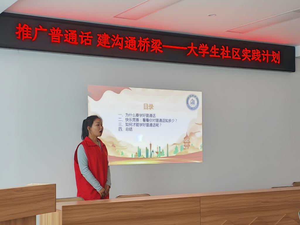 本次活动的主题是“推广普通话,建沟通桥梁”。在宣讲活动开始前,团支部成员首先通过一则趣味小故事,引入为什么要学好普通话的话题。普通话是素质教育的重要内容,使用普通话进行交际,既有利于培养爱国主义情操,又能增强民族凝聚力。在活动中,团支部成员带领社区居民开展互动小游戏,如基础知识问答和趣味绕口令等等。游戏结束后,参与人员受益匪浅。社区居民纷纷表示,在积极参与活动、体验乐趣的同时,也体会到了说好普通话的意义和重要性。活动最后,团支部成员与参与活动的社区居民一起合影留念。
