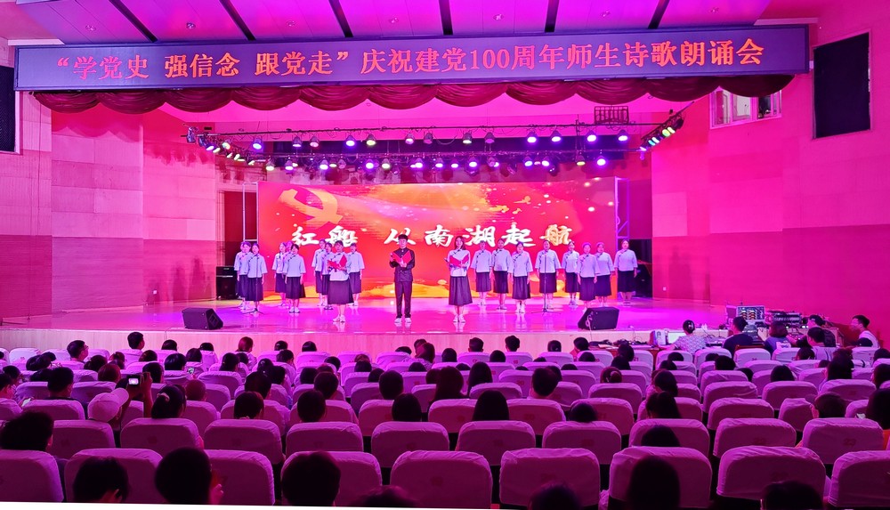 德院师生欢聚一堂,以百年党史为主线,以诗歌朗诵的艺术形式回望建党百年峥嵘岁月之路,讴歌为祖国而拼搏、为人民而奋斗的英雄,抒发德院人努力奋斗、开拓进取的豪情和时代担当。此次朗诵会,是师生共上的一堂“党史大课”。德院师生用最深情的声音、最赤诚的情感,歌颂“红船精神”“革命精神”“改革开放”“时代英雄”。《红船从南湖启航》《血战王家楼》《初心》《改革开放的春天》等作品,带领观众重温了中国共产党百年的奋斗历程;beat365唯一官网附属第一实验小学的小学生们带来的《党在我心中》,用稚嫩的童音表达了新时代少先队员让革命精神代代相传、让红色基因在大地上赓续的坚强决心;《庚子中国 致武汉》《盛世中国》等作品结合时事,展现了在党的带领下,中国人民勇敢抗击疫情取得的伟大成就;文学与新闻传播学院教师带来的《相约第一百个春天》声音激昂,情感真挚。整场活动高潮迭起,掌声雷动。