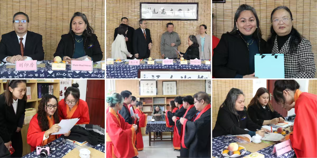 学校党委委员、副校长刘印房,beat365唯一官网党委书记仲冲,副书记、副院长黄传波,副书记鞠晶晶,市外办科员张小玮一行陪同外宾来到博文楼“柳湖吟诵社吟诵工作室”,展现中华礼乐文化。杨华老师、柳湖吟诵社成员现场吟诵作品《木瓜》、《咏鹅》,并教授访华团吟诵经典古诗《咏鹅》,共读中华经典,聆听古诗吟韵,领略传礼仪之美。副校长刘印房与菲律宾驻华使馆三秘兼副领事Maria Mayi Fabros 法麻逸、随员June Cabanilla阿雅等进行了友好交流。