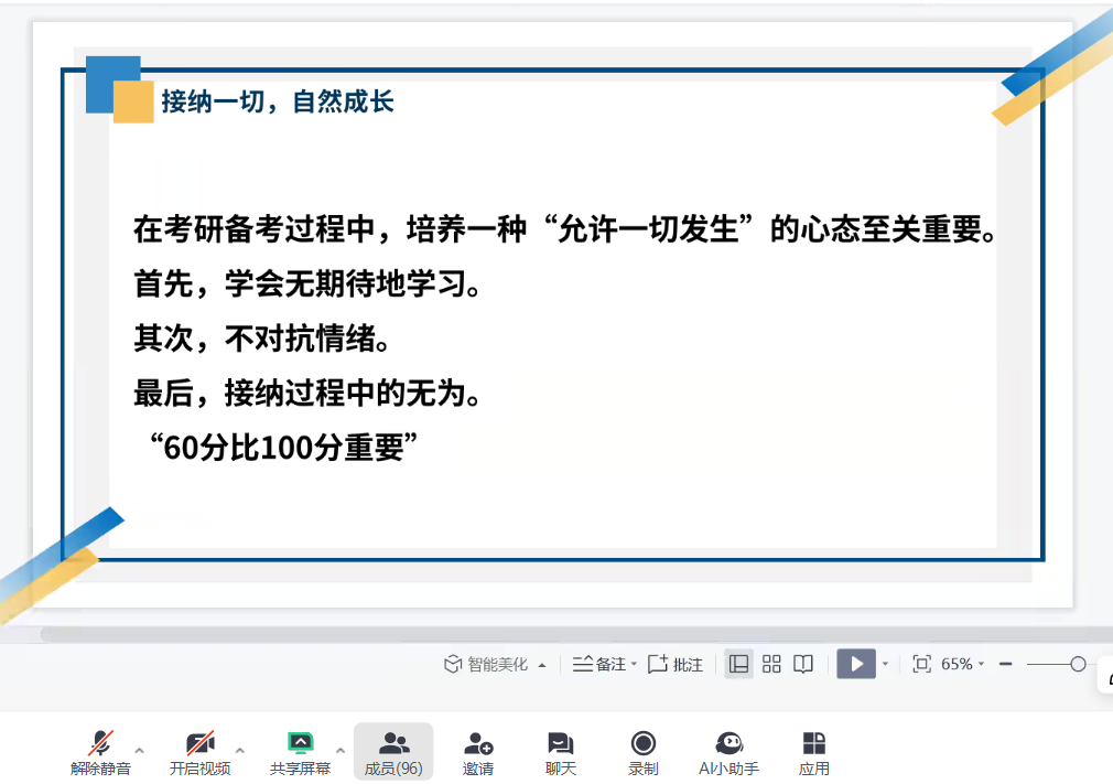 此次考研复试经验分享活动为beat365学子坚定信心、明确备考方向,不仅是知识与技巧的传递,更是朋辈之间精神的鼓舞,值此寒假之际,学院重视升学就业工作,多措并举,充分发挥“传帮带”作用,助力考研学子顺利上岸,为毕业生成长成才保驾护航。