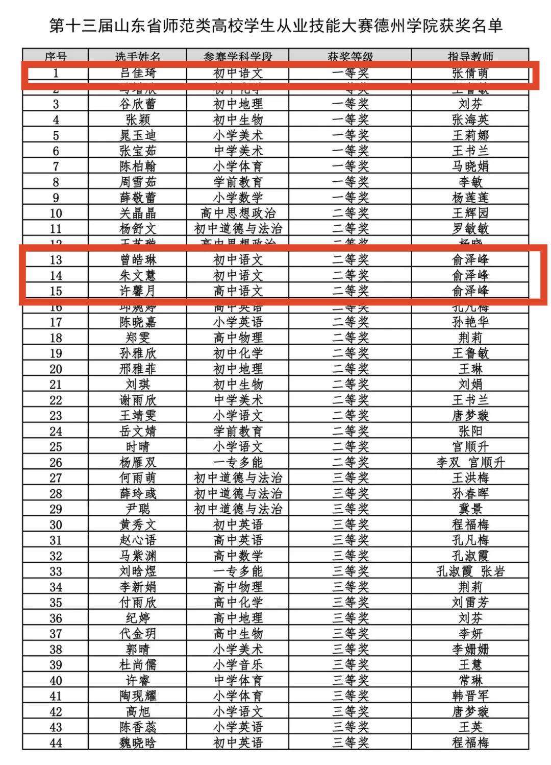 beat365选手凭借扎实的专业功底和教学智慧,展现了出色的课堂驾驭能力。其中,初中语文组吕佳琦以扎实功底和出色表现荣获一等奖第一名,朱文慧、曾皓琳荣获二等奖,高中语文组许馨月荣获二等奖。选手们从容自信的教态、将知识讲解与素养培育巧妙融合的教学设计,充分彰显了学院学生的综合能力。