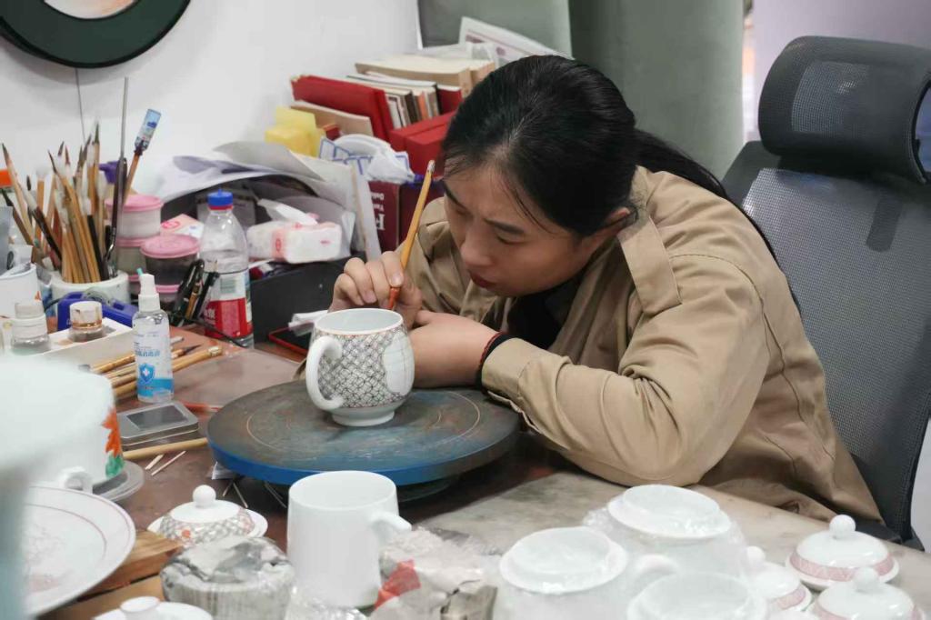 随后,师生先后参观红绿彩馆藏展品区与工艺作坊。在展品区,大家近距离观察不同时期红绿彩瓷器的器型、釉色与纹饰特点,了解其从宋代起源、明清发展至现代创新的历史脉络;在工艺作坊,非遗传承人现场演示了红绿彩制坯、施釉、绘画、烧制等关键工序,讲解传统技艺的技法要点与传承困境。师生们围绕 “红绿彩工艺的历史演变”“传统技艺与现代设计的融合” 等话题与工作人员深入交流,为后续研究积累一手资料。