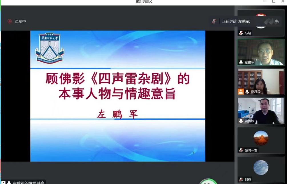 11月24日晚,广东省高等学校珠江学者特聘教授,广东省宣传思想文化领军人才,华南师范大学教授、博士生导师,华南师范大学国际文化学院院长、岭南文化研究中心主任,全国汉语国际教育专业学位研究生教育指导委员会委员,中国近代文学学会副会长、中国近代文学学会小说分会会长左鹏军应邀做了主题为“顾佛影《四声雷杂剧》的本事人物和情趣意旨”的线上讲座。