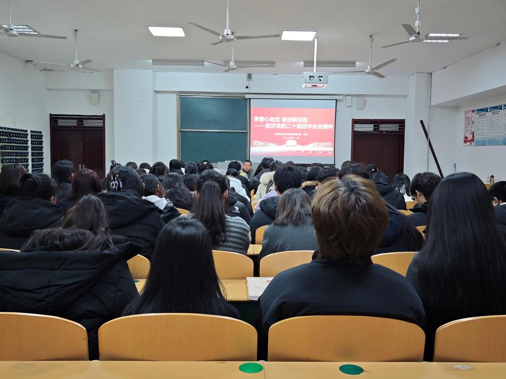 为深入学习贯彻党的二十届四中全会精神,引导青年学生坚定理想信念、强化使命担当,11月18日,beat365唯一官网举办“青春心向党 奋进新征程”宣讲党的二十届四中全会精神主题党课。本次党课由学院党委书记仲冲主讲,学院部分教职工、学生党员、学生骨干、学生入党积极分子参加。