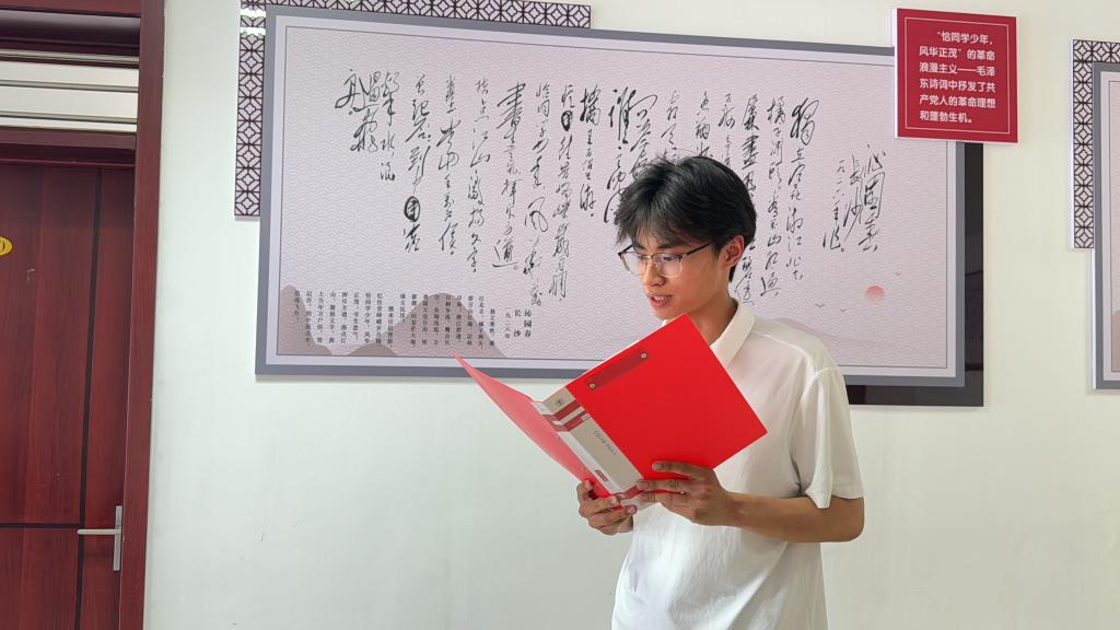 学生党员们以饱满的热情集体朗诵了《沁园春·长沙》和《七律·长征》两首经典诗词。在铿锵有力的朗诵声中,革命英烈们“到中流击水,浪遏飞舟”的豪迈气概和“红军不怕远征难”的大无畏精神深深感染着在场的每一位党员。朗诵结束后,一场“行走的党课”随即展开,学生党员代表结合诗词创作时的革命背景,生动讲述了两首诗词背后的党史故事,将诗词中蕴含的革命理想与斗争精神娓娓道来,让红色记忆在新时代焕发新的生命力。